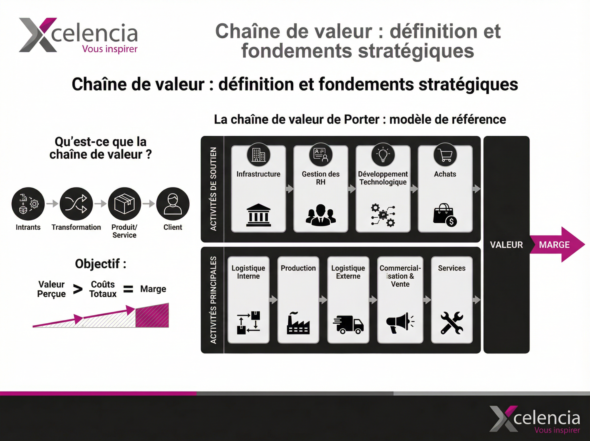 C'est un modèle qui décompose l'entreprise en une série d'activités principales et de soutien. Elle permet d'identifier comment chaque étape contribue à la création de marge et à la satisfaction du client final.