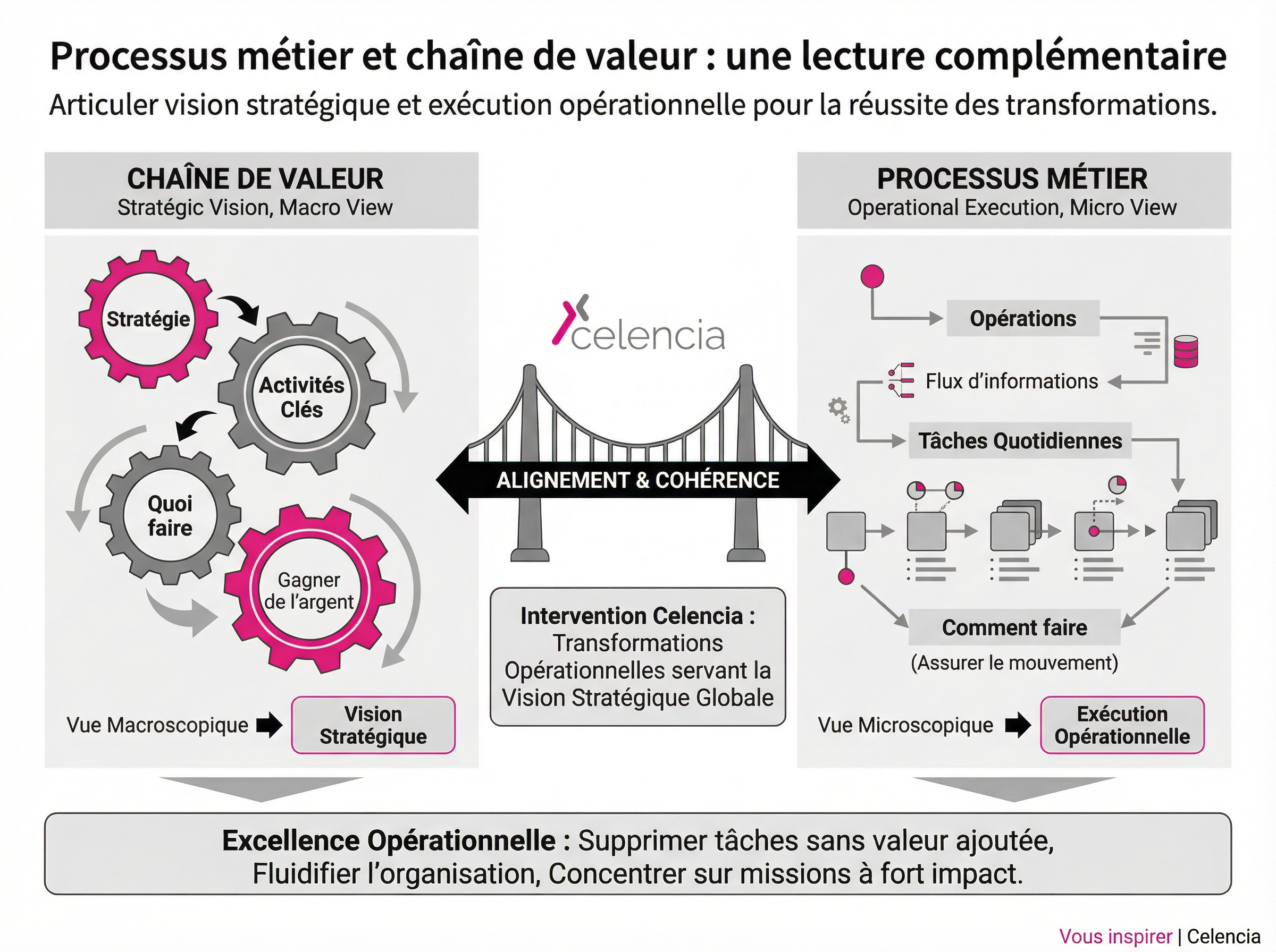 La cohérence entre la stratégie et l'opérationnel détermine l'efficacité du modèle. Le pilotage des activités doit s'assurer que chaque processus métier soutient une activité clé de la chaîne de valeur. C'est dans cette logique d'alignement que nous intervenons chez Celencia, en veillant à ce que les transformations opérationnelles servent toujours la vision stratégique globale.