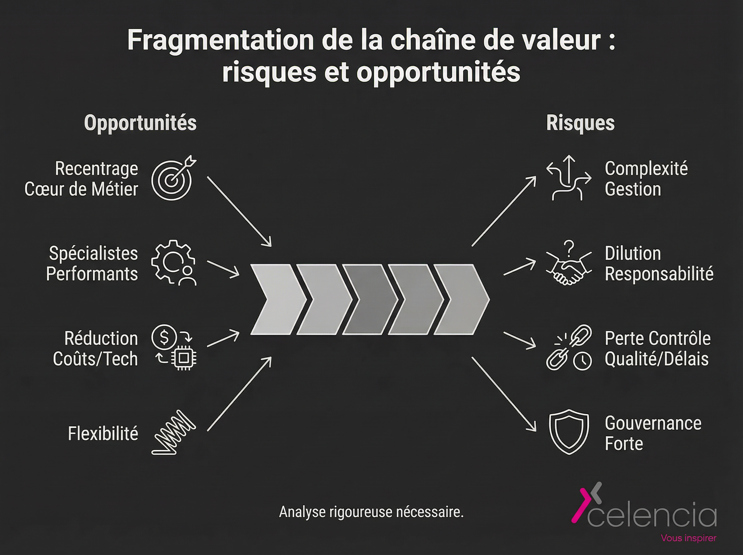 Cette fragmentation comporte toutefois des défis. Multiplier les partenaires complexifie la gestion des flux et dilue parfois la responsabilité. Maintenir une création de valeur cohérente demande une gouvernance solide pour orchestrer ces différents acteurs.